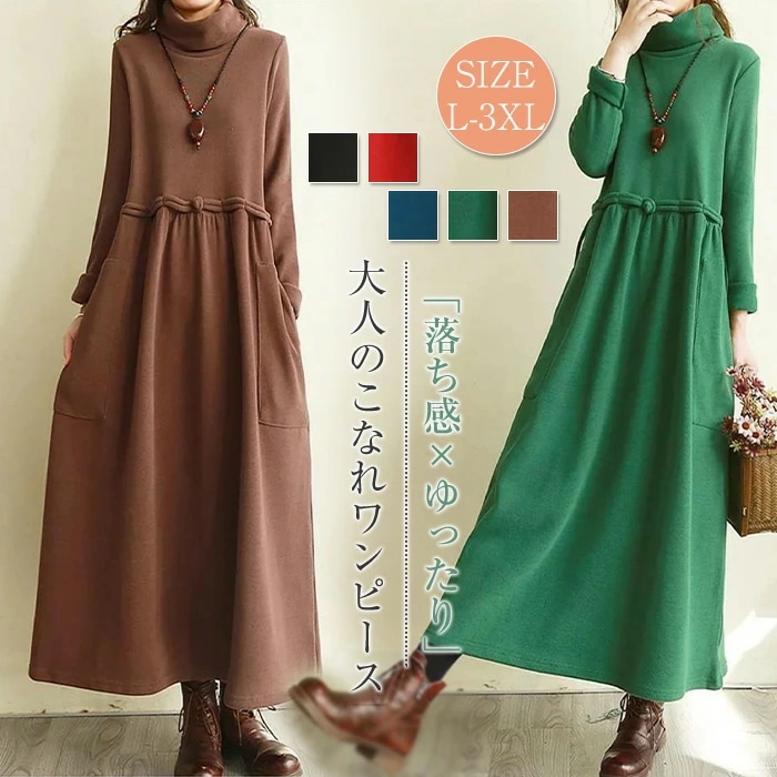 ロングワンピース レディース ワンピース 長袖 無地 ロング丈 春 秋 冬 ハイネック タートルネック ロング丈 裏起毛 ハイウエスト ギャザー ポケット付き ボア 防寒 保温 秋冬ワンピース ゆった