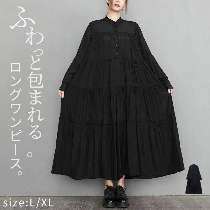 ロングワンピース レディース ブラック ひざ下 ロング丈 丸首 春 夏 秋 冬 長袖 無地 落ち感 着回し ギャザー ティアード スタイルアップ フレア Aライン シンプル オシャレ カジュアル ゆっ