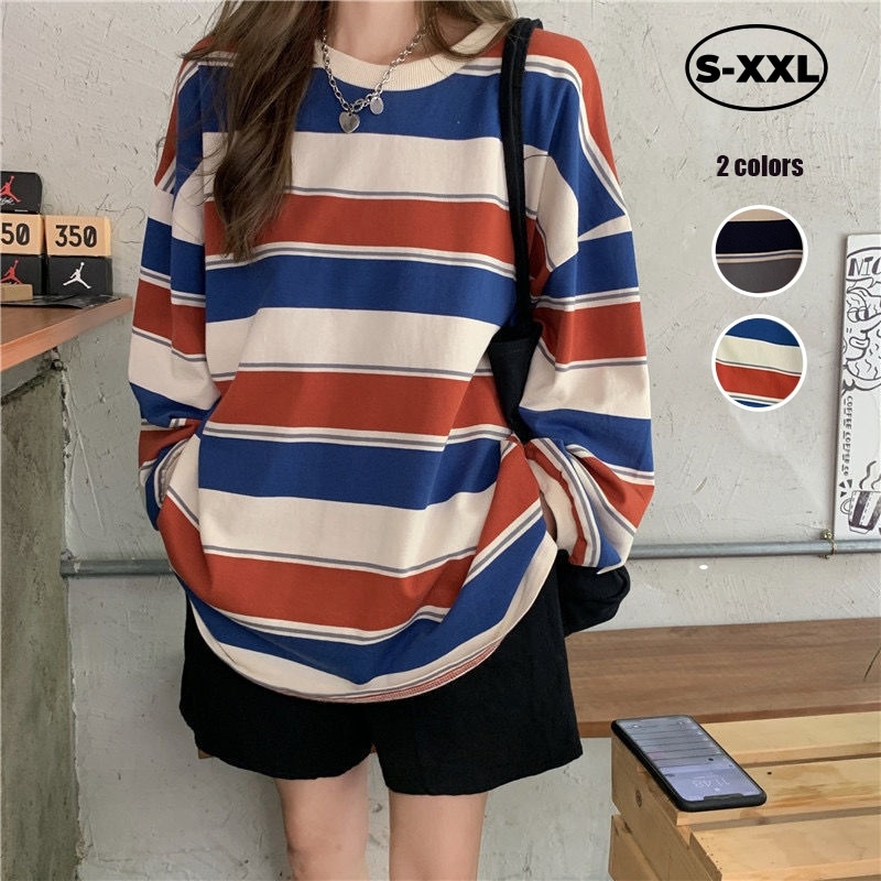 Tシャツ初秋の野生の縞模様の長袖トップスTシャツ女性の学生の緩い原宿怠惰な秋服ボトムシャツの韓国語バージョンロンT Tシャツ カットソー
