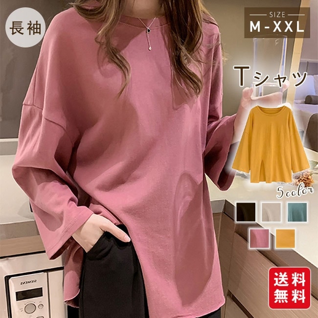 Tシャツ レディース 長袖 カットソー ロング トップス 重ね着 丸首 カジュアル 無地 ベーシック シンプル 体型カバー Tシャツ カットソー