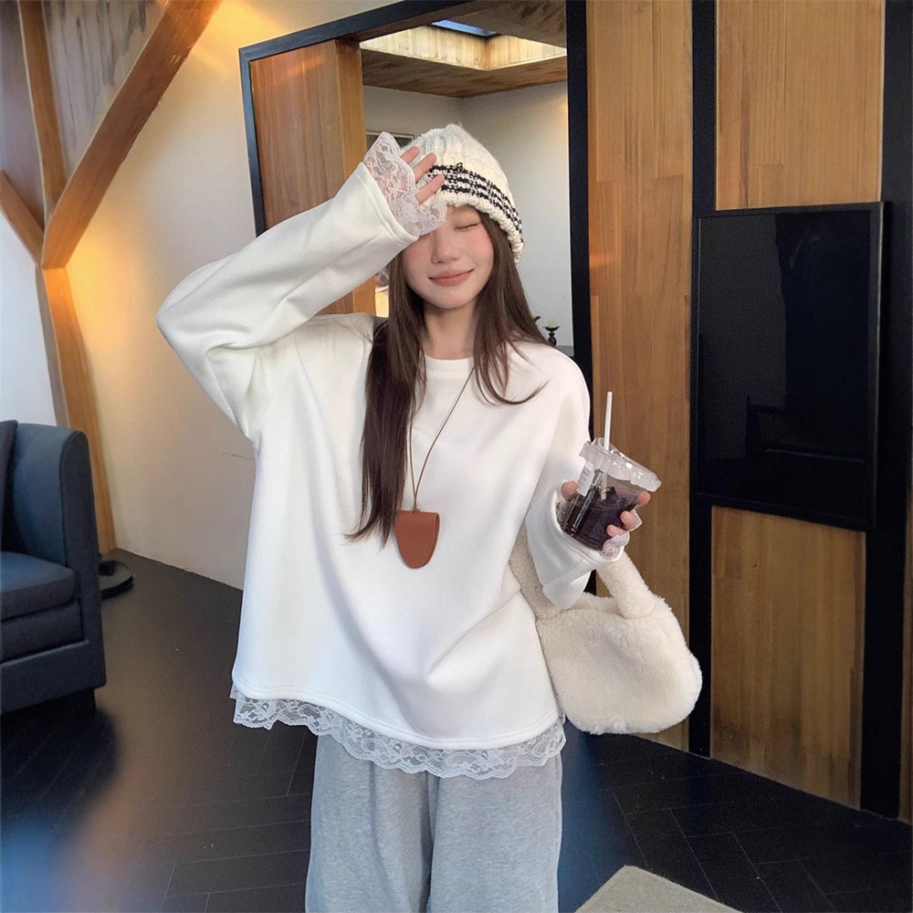 Tシャツシンプルなスタイルの白いレースのレースの長袖Tシャツ2025秋新作カジュアル緩い暖かいボトミングトップス女性ロンT Tシャツ カットソー