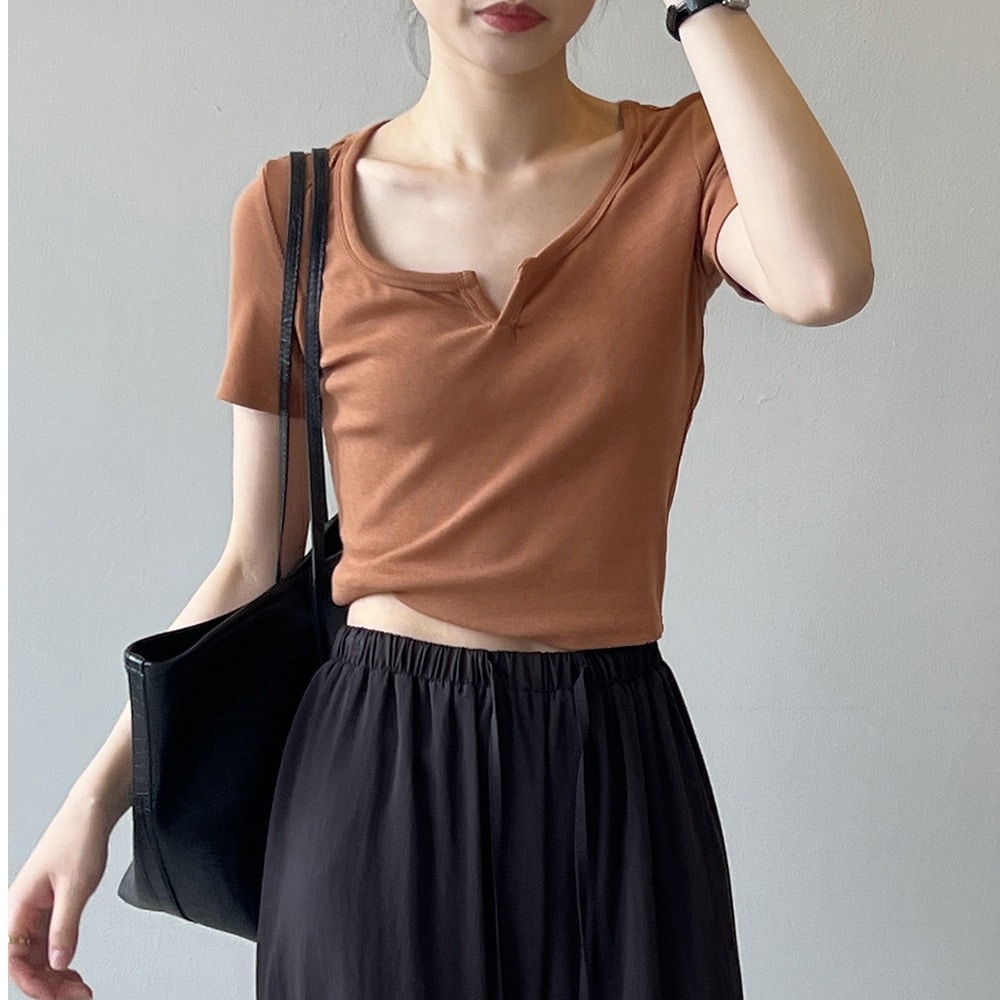 韓版半袖tシャツ2025夏新作ニッチデザイン感スリムショート上着無地着痩せ Tシャツ カットソー
