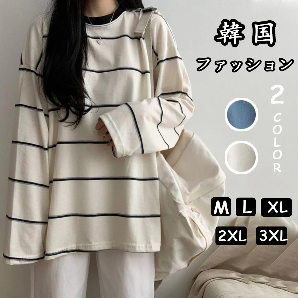 ニットタッチ万能ボーダーカットソー Tシャツトレーナースウェットトップス ストレッチドロップショルダー韓国ファッション Tシャツ カットソー