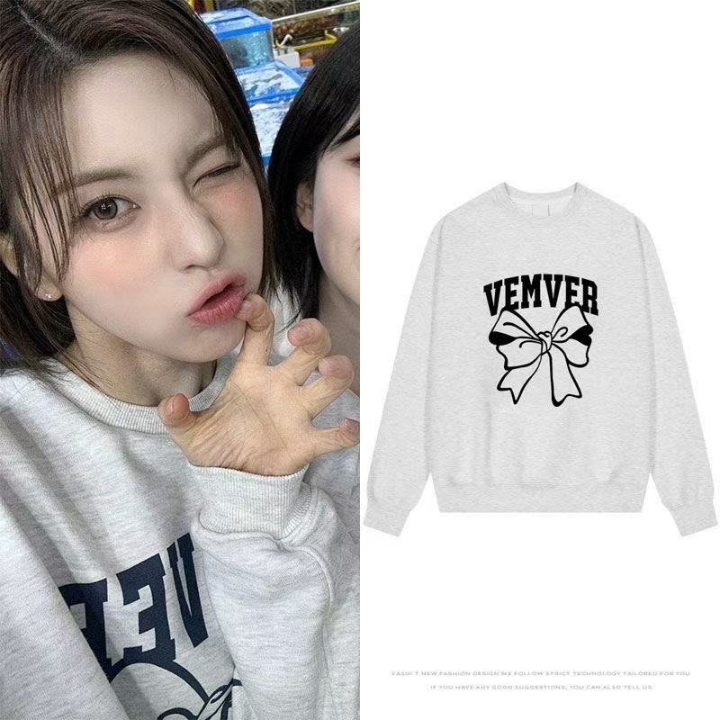 NMIXX服ペ真率着用衛服ゆったり花灰色プリントラウンドネックにスエード厚手薄手春秋冬服 Tシャツ カットソー