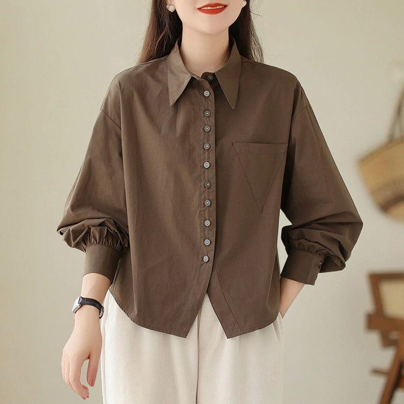 ブラウス レディース 長袖 トップス ポケット付き 襟付き 無地 オフィス ゆったり 大きいサイズ シンプル カジュアル おしゃれ 体型カバー 着痩せ 通勤 日常 旅