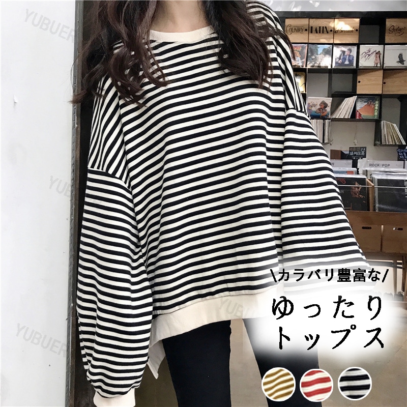 袖レディーストップス長袖トレーナーカジュアルゆったりロング テールオーバーサイズボーダークルーネックコットンふわふわ春秋冬 Tシャツ カットソー