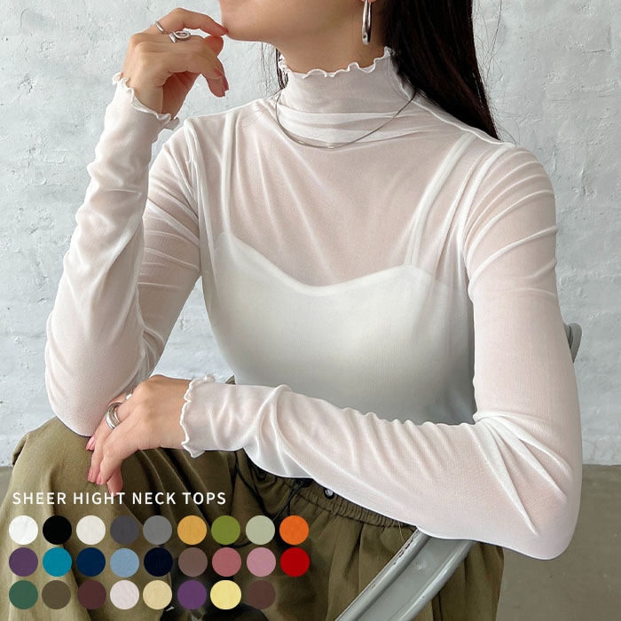 NEW シアー ハイネック トップス おしゃれ 肌隠し レース メロー 透け感 インナー 無地 長袖 ストレッチ シースルー Tシャツ カットソー まとめ買い