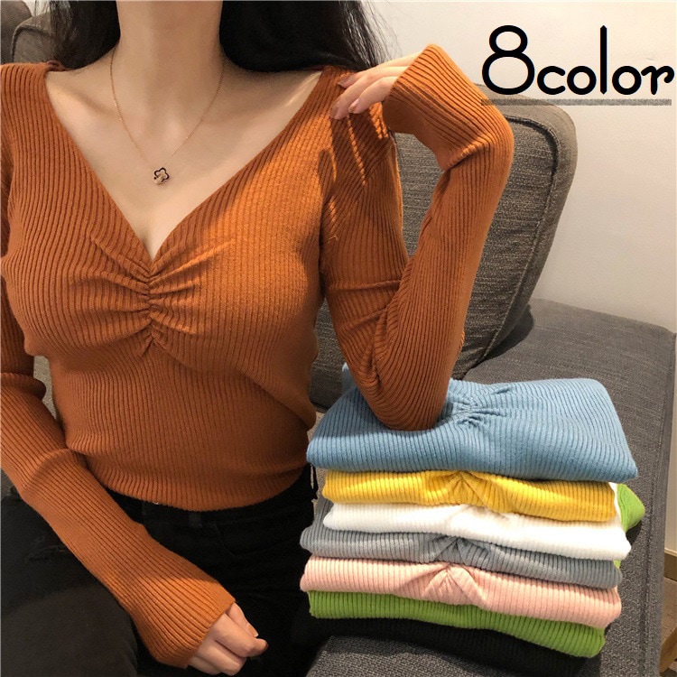 カットソー 長袖 ロングTシャツ レディース 女性 トップス Vネック ギャザー シャーリング リブ生地 無地 単色 おしゃれ シンプル カジュアル かわいい 着回し 定番 ベーシック お出かけ 通勤