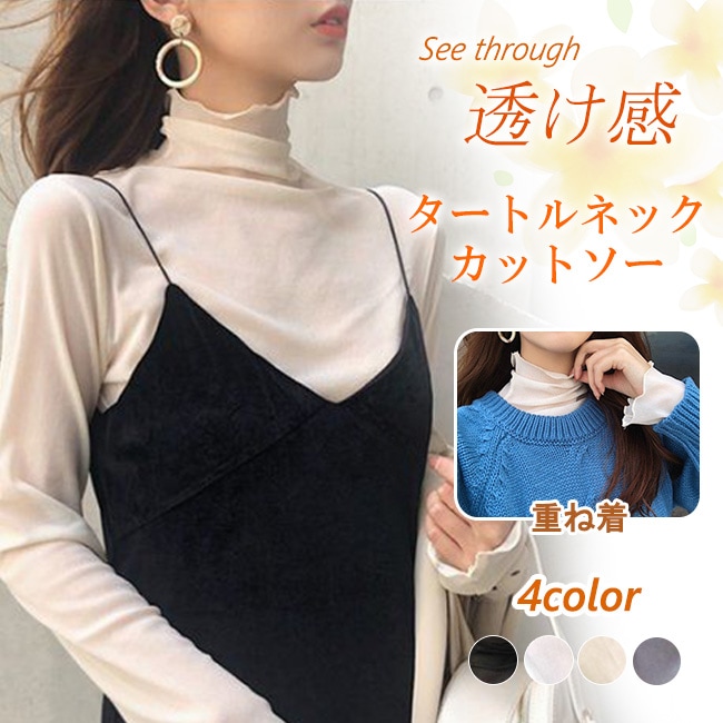 シースルー カットソー インナー 透け感 レディース 長袖 薄手 重ね着 トップス おしゃれ タートルネック レイヤード コーデ 無地 柔らかい OL 通勤 オフィス フリルネック 着痩せ Tシャツ