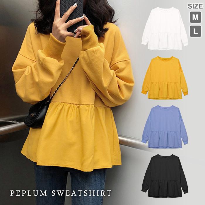 スウェット レディース 春 白 黒 トレーナー カットソー ホワイト ブラック キャメル ブルー トップス 長袖 チュニック ペプラム 20代 30代