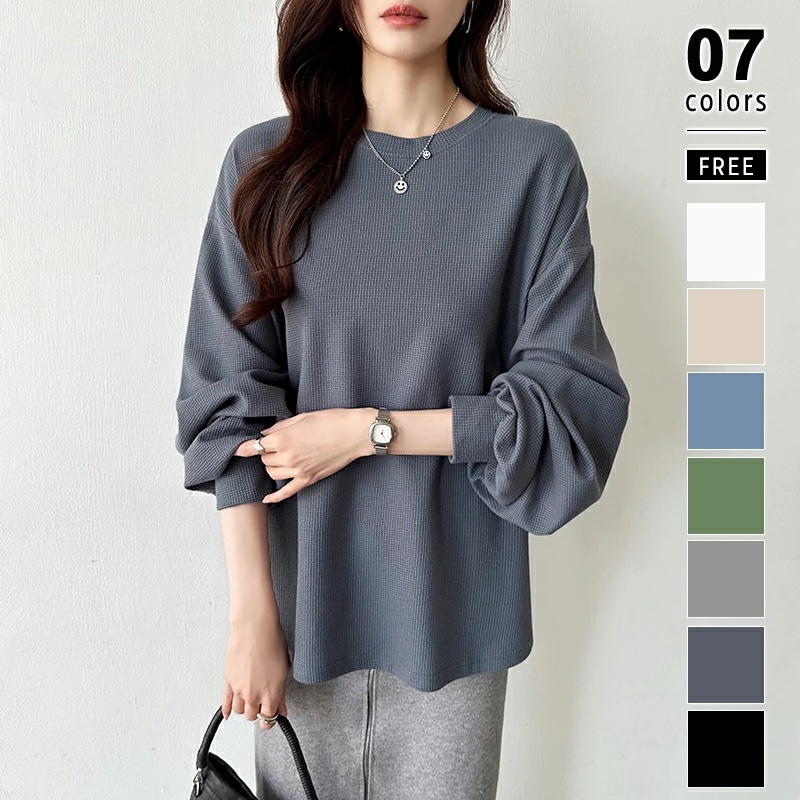 ラウンドヘムワッフルカットソー ボリューム袖 ロンT オーバーサイズ ボリューム袖 ワッフル カットソー 長袖 レディース ゆったり tシャツ トップス ドロップショルダー クルーネック