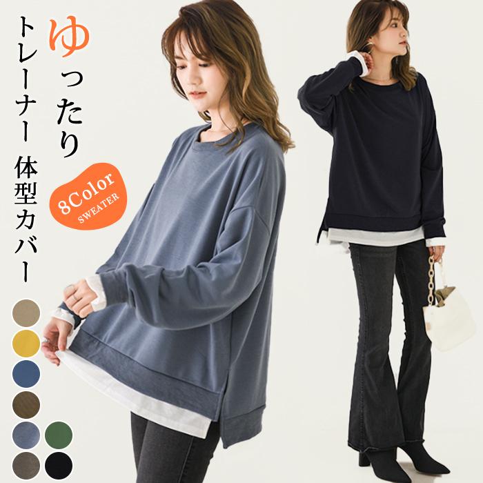重ね着風トレーナー レディース 長袖 トップス カジュアル スウェット 無地 ゆったり トレーナー きれいめ 可愛い フリーサイズ パーカー カットソー トップス