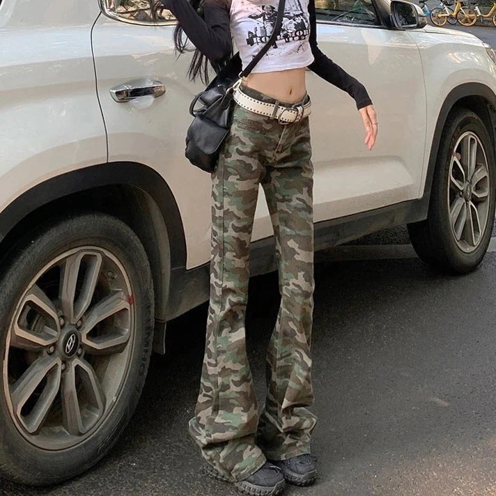 2タイプ パンツ ジーンズ 迷彩柄 カーゴパンツ ロングパンツ ロング丈PLUS丈 ハイウエスト フィット ストレッチ 着痩せ ボトムス レディース ダンス カジュアル10691069