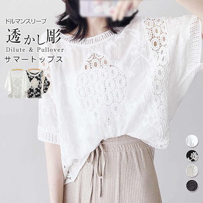 ブラウス レディース 半袖 夏 透かし彫り レース 花柄 シースルー 透け感 ドルマンスリーブ トップス 綿 コットン 可愛い 刺繍 プルオーバー フリル Tシャツ ゆったり おしゃれ きれいめ フェ