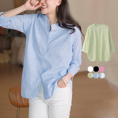 シャツ ブラウス ダブルガーゼ レディース ガーゼ シャツ ブラウス 七分袖 春 夏 秋 冬トップス チュニック 無地 バンドカラーガー ゼシャツ 2重がーぜ ゆったり 体型カバー カジュアル ナチ