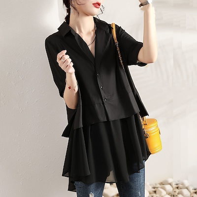 Tシャツカットソーシアーシャツ シフォンブラウス Tシャツ体型カバーブラウス カーディガン straykids2024春新作フェイクレイヤード straykids 透け感