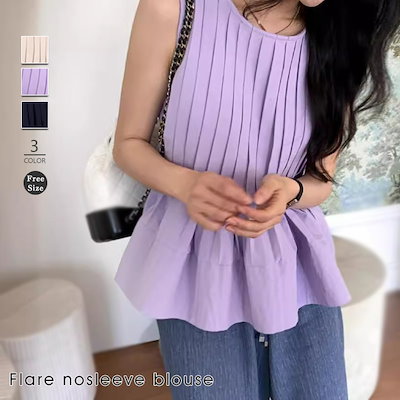 ブラウス トップス シャツ レディース ノースリーブ 春 夏 無地 タンク クルーネック 丸首 大きいサイズ シンプル チュニック プリーツ フリル フレア Aライン ゆったり 体型カバー おしゃれ