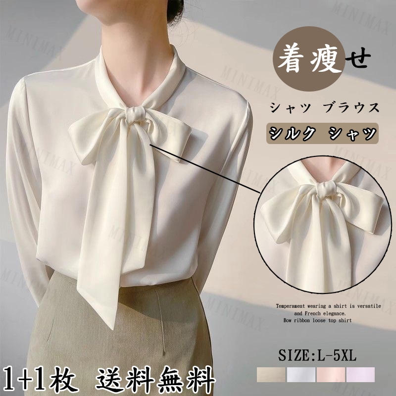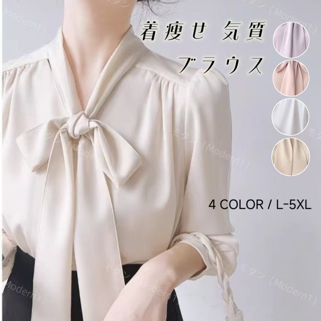 2025 新作 レディースブラウス長袖シャツ オフィスガーリーリボン付きボウタイトップス シャツカジュアルゆったり春秋 体型カバー 大きいサイズオフィスカジュアル