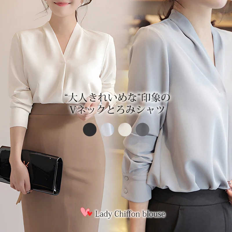 シフォンブラウス レディース 長袖 Vネック 春 秋 薄手 きれいめ 大きいサイズ オフィス シャツ ブラウス フォーマル スキッパー 抜き襟 とろみシャツ トップス 韓国ファッション