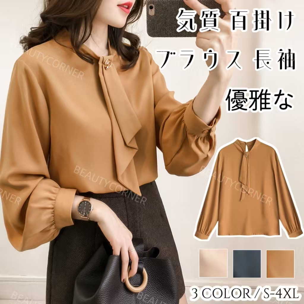 ブラウス レディース リボンネック リボン 立ち襟 長袖 トップス 無地 春 夏 秋 きれいめ 大人 シンプル カジュ シャツ ブラウス