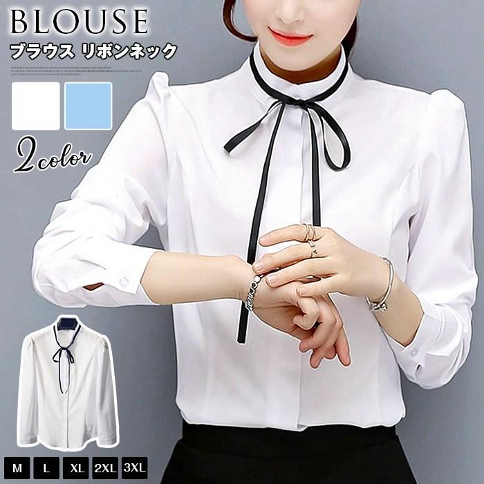 ブラウス レディース リボンネック リボン 立ち襟 長袖 トップス 無地 春 夏 秋 きれいめ 大人 シンプル カジュ シャツ ブラウス