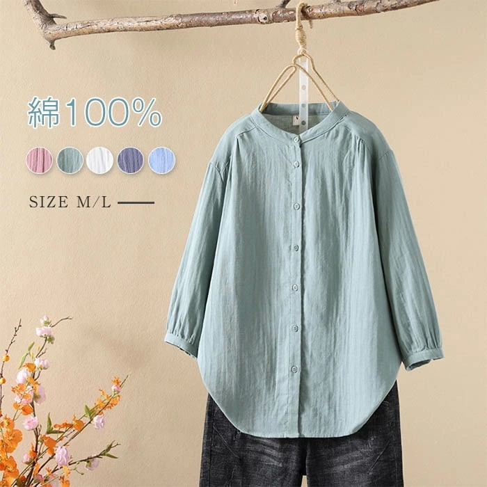 ガーゼ シャツ 2重ガーゼ シャツブラウス レディース 半袖 トップス 春 夏 ガーゼシャツ 羽織り バンドカラー ギャザー 柔らかい 柔軟 大人 カジュアル ナチュラル ダブルガーゼ 体型カバー ゆ
