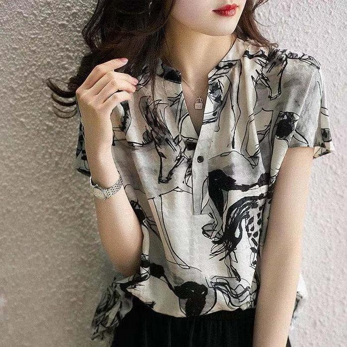 ブラウス レディース 40代 春夏新作 オシャレブラウス シフォンブラウス プリント Vネックブラウス 上品 半袖トップス 韓国風 大人 通勤 ゆったりシャツ 30代