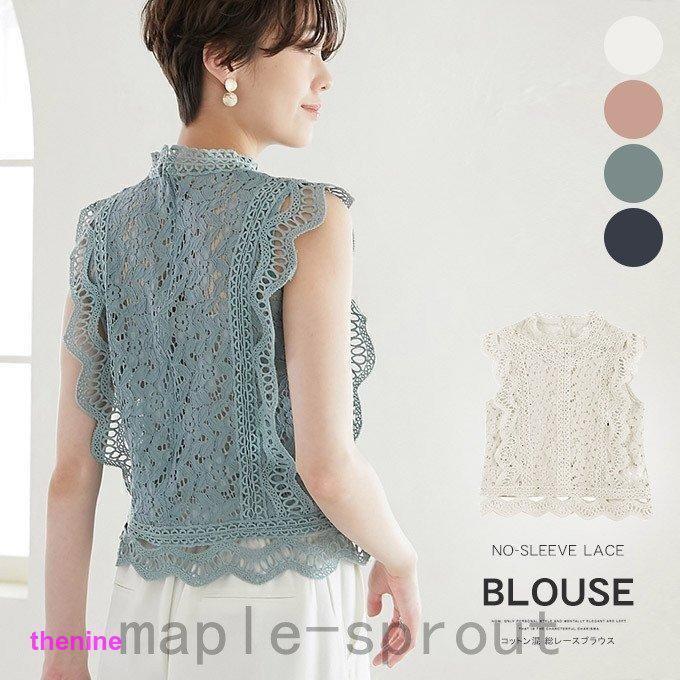 新作ブラウス レディース 総レース フリル袖 ノースリーブ プチハイネック トップス インナー シャツ ブラウス