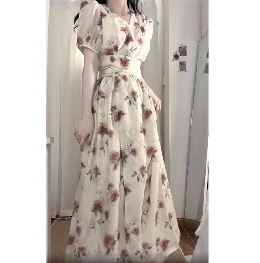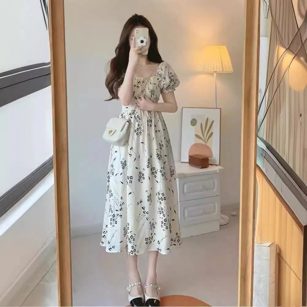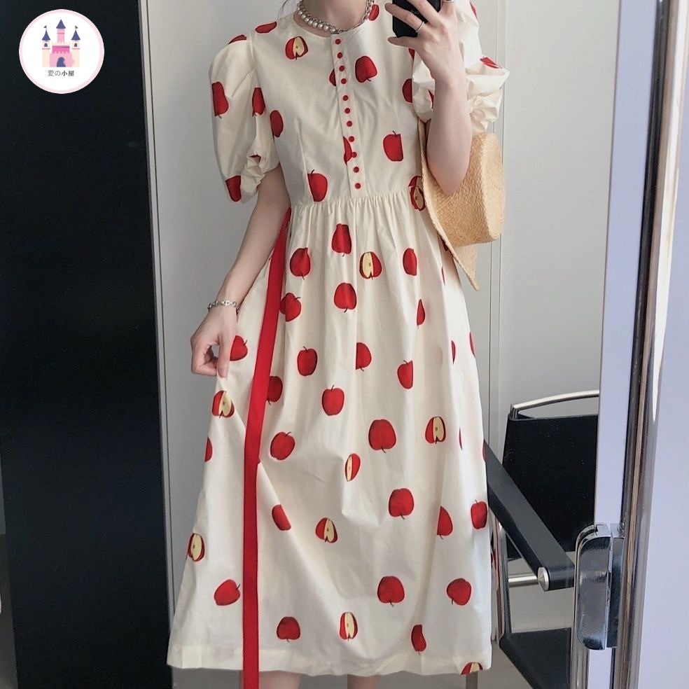 ドレスフレンチスイートアップルプリントのバブリースリーブウエストリボンリゾートワンピース女子学生優しい風ロングスカート子女 プリント 柄ワンピ