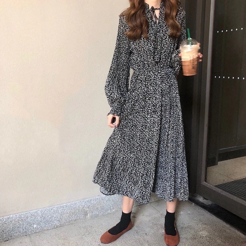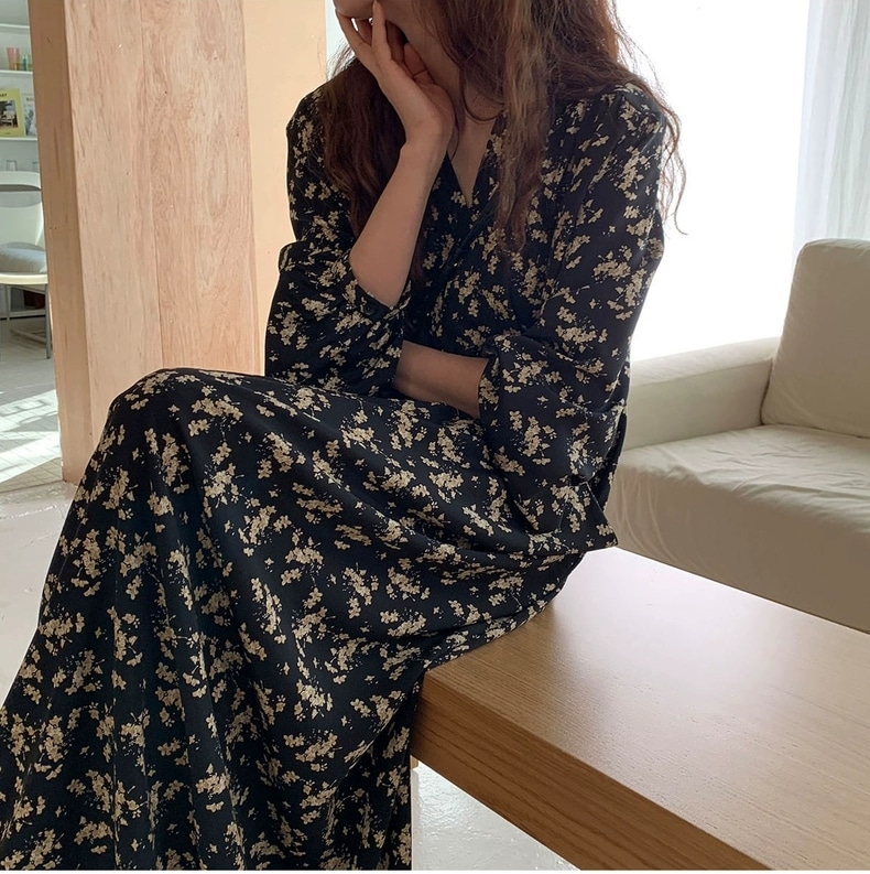 meelissey韓国デザイン感秋レトロエレガントVネックフルスクリーン花ゆったり多彩な大きなポケット長袖ワンピース プリント 柄ワンピ