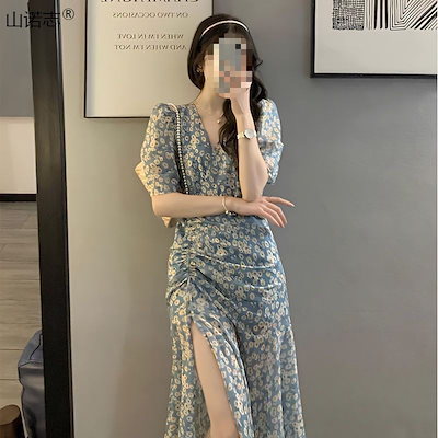 ワンピース夏 開襟デザイン感 韓国ファッション ウエスト丸め半袖 百掛け ワンピース女 プリント 柄ワンピ