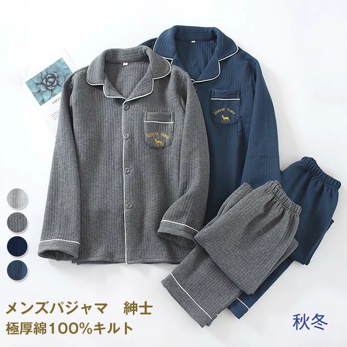 パジャマ メンズ 綿100% キルト 長袖 前開き 冬 上下セット M L ルームウェア 肌に優しい 暖かい 冬用 入院 紳士 旅行 無地 シンプル コットン 厚手 春 秋 男性 部屋着
