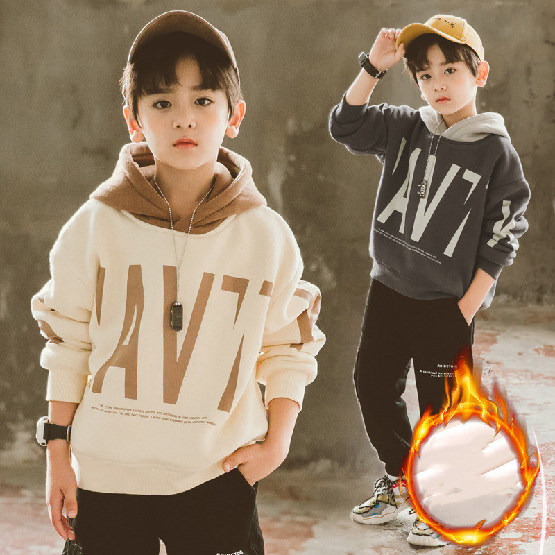2024冬の新型韓国版子供用裏起毛加厚連帽アルファベット衛衣男女子供用ゆったり頭上着パーカー トップス