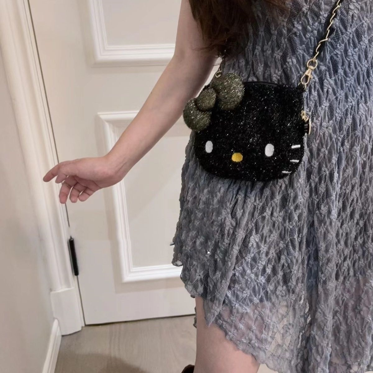 新作入荷 hello kitty きらきら 大きな顔 バッグ ファッション 銀糸 かわいい ブラック レディース トートバッグ ショルダーバッグ
