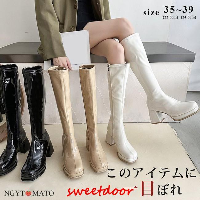 ロングブーツ レディース ブーツ 厚底 ロング丈 スクエアトゥ チャンキーヒール サイドジッパー PU 艶あり 美脚 カジュアル おしゃれ履きやすい 歩きやすい