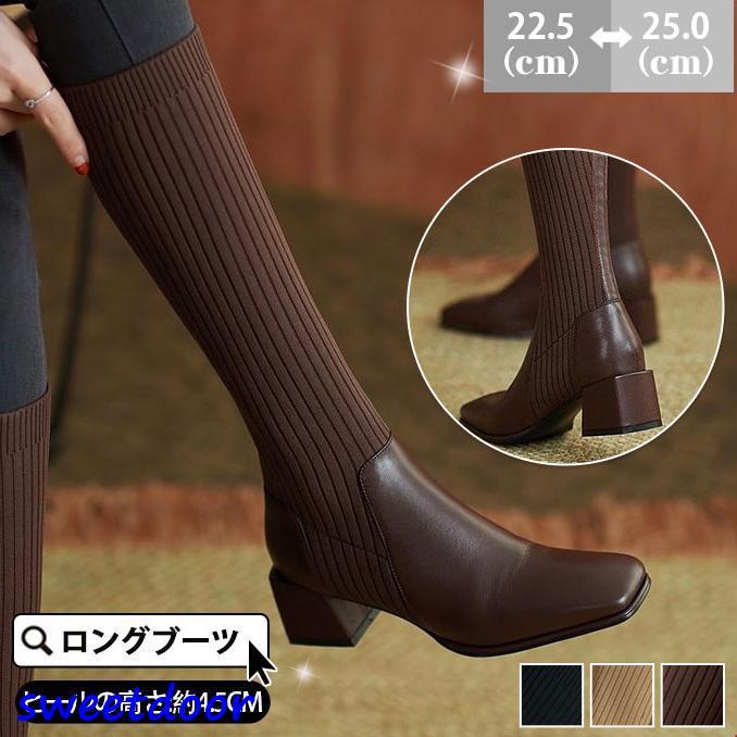 ロングブーツ レディース ブーツ 太ヒール スクエアトゥ トレンド シンプル ローヒール 美脚 おしゃれ 歩きやすい 履きやすい ストレッチ