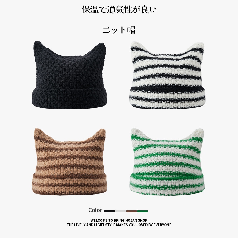 秋冬 可愛いネコ耳毛糸帽子 レディース ストライプ 保温 ニット帽 カップルコーデ キャップ バケットハット ニット帽