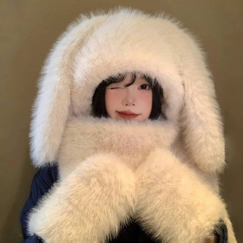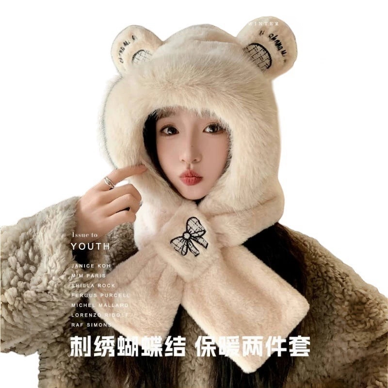 冬用の可愛いくま耳つきの帽子とスカラフがセットで耳を暖かく守る保温性のモフモフ帽子と防寒手袋がセットです 耳あて イヤーマフラー