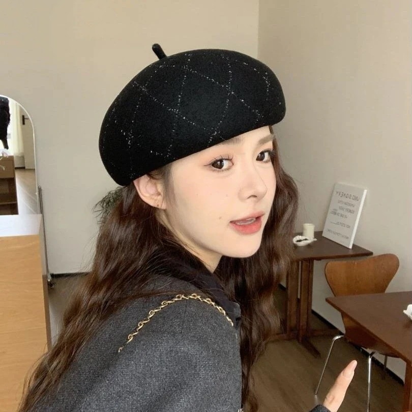 羊毛格子縞のラインストーンのベレー帽の女性の新しい秋と冬の暖かい画家の帽子の大きい頭囲のショー顔の小さい帽子 ベレー帽