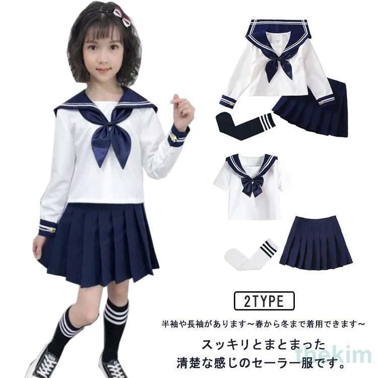 キッズ 半袖 長袖 学生服 衣装 セーラー服 スーツ 子供 女の子 こどもスーツ 女子高生 制服 上下セット セーラーセット 4点 コスチューム
