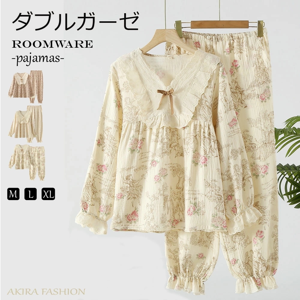 ルームウェア レディース ダブルガーゼ 快眠 可愛い レース 刺繍 花柄 パジャマ 綿100% 上下セット ナイトウェア 長袖&長ズボン ポケット付き 部屋着 敏感肌 通気性 蒸れにくい 優れた耐久性