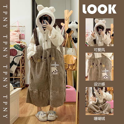 3type 着ぐるみパジャママinsかわいいミルクティーベアー保温パジャマ女性冬珊瑚絨毯加絨毯厚手 パジャマ