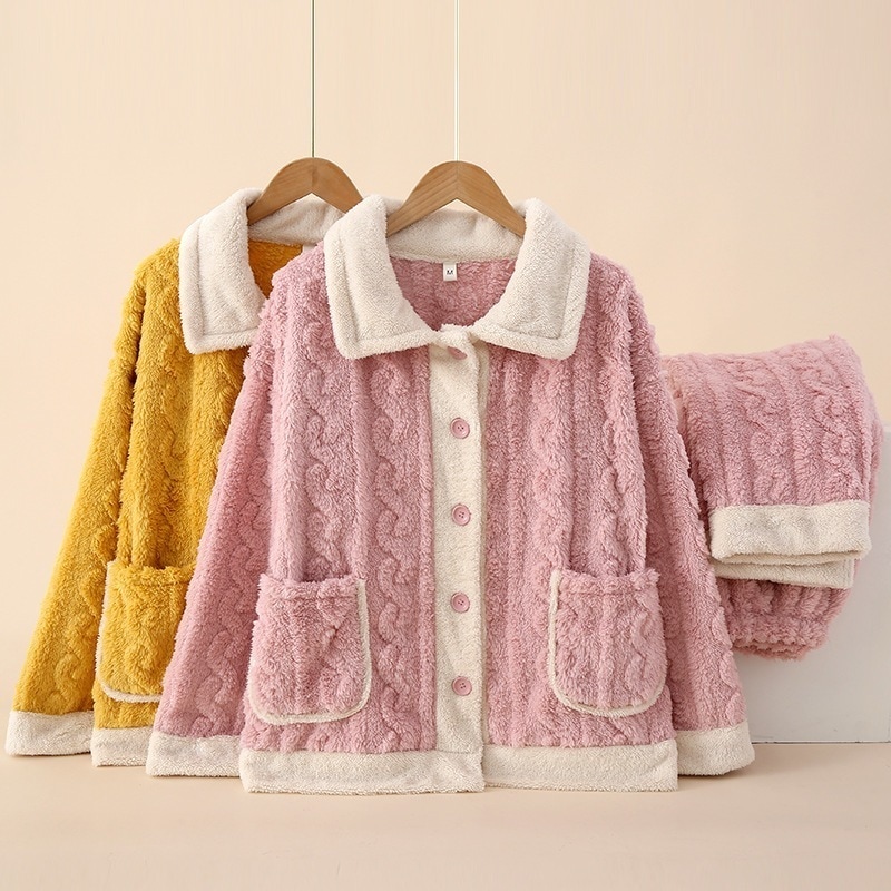 秋冬 ニュースタイル 厚手 コーラルフリース レディース パジャマ 開き襟 ルームウェア セット 裏起毛 厚手 ルームウェア パジャマ