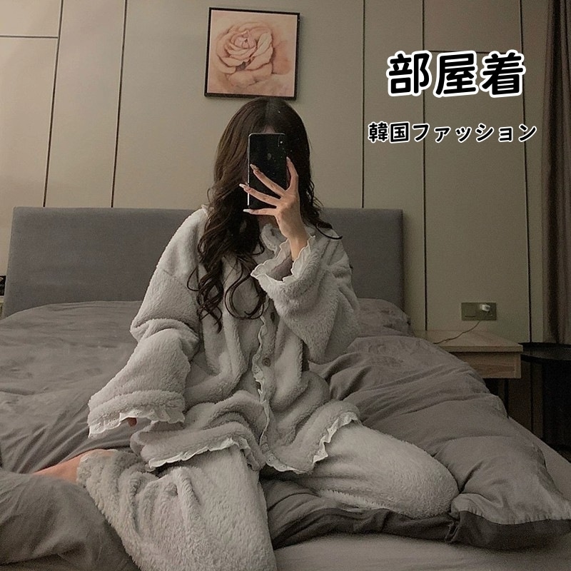 韓国ファッション 部屋着 秋冬 可愛い 裹起毛 もこもこフランネル ルームウェア セットアップ ゆったり快適 パジャマ レディース 冬暖かい 大きいサイズパジャマ 下着