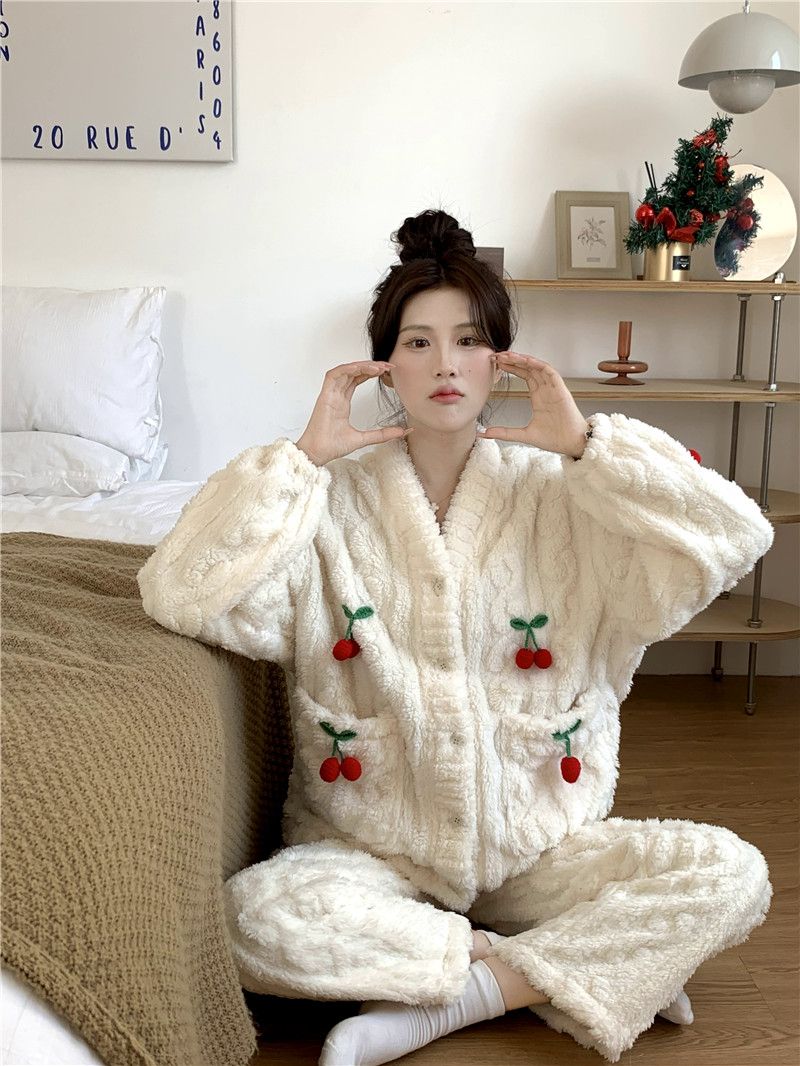 甘いさくらんぼ長袖サンゴベルベットパジャマ女性カーディガン少女小香風ベルベット厚い保温家庭服冬メガ割 メガ割 秋冬 裏起毛 ルームウェア 上下セット 長袖