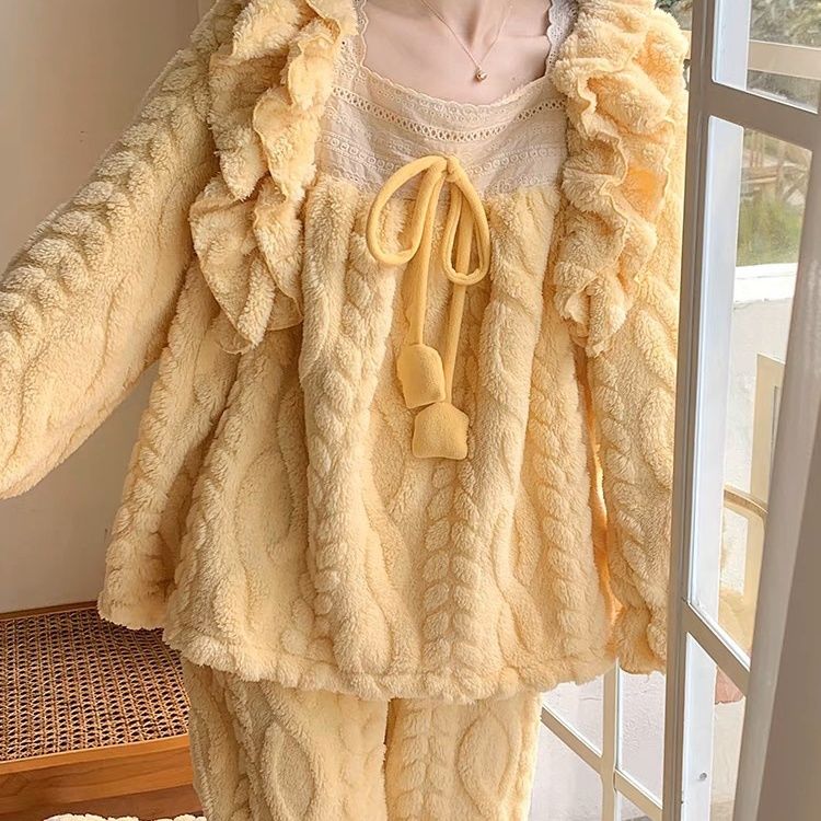 2024新型秋冬リボン厚手ドローウォームスーツカジュアルルームウェアパジャマコーラルベルベット女性用 パジャマ