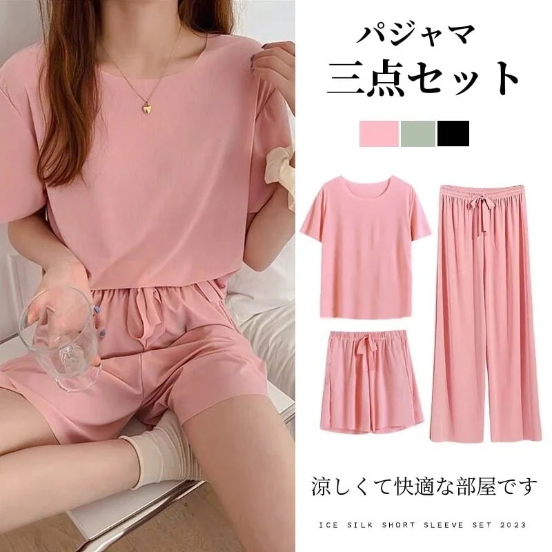 無地 部屋着 夏パジャマ 半袖ルームウェア 韓国ファッション 快適 レディース 丸ネック 三点セット ゆったりアイスシルク パジャマ