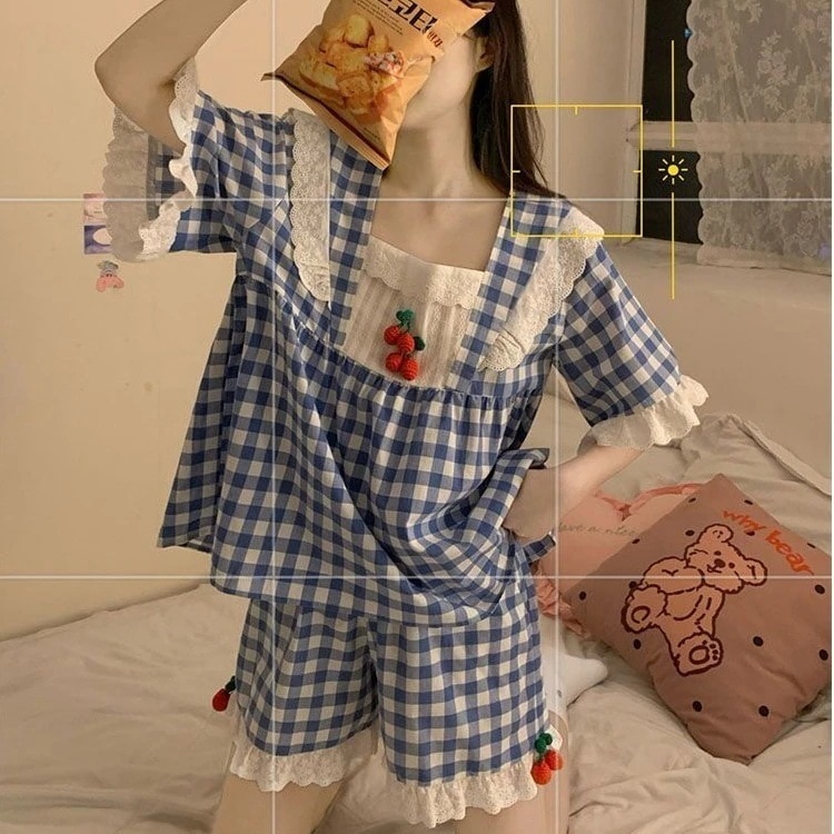 部屋着 上下二点セット セットアップ 可愛い 夏 パジャマ 学生 半袖 20代30代 チェックパジャマ レディース ルームウェア レース辺 韓国ファッション