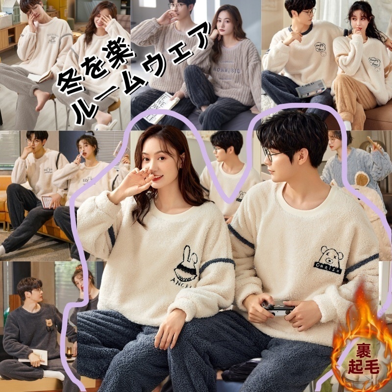 カップルパジャマ 冬 裹起毛 ルームウェア 韓国ファッション 部屋着 セットアップ 可愛い 快適 パジャマ レディース 冬 暖かい パジャマ メンズ