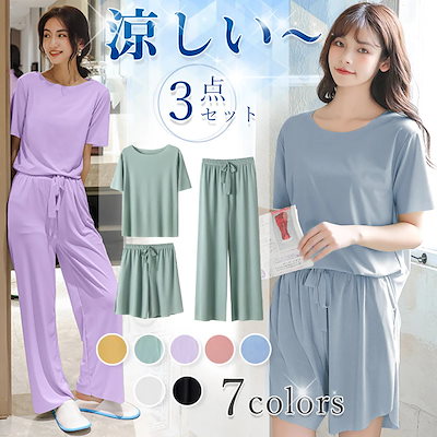 さらさら涼感 ルームウェア 3点セット パジャマ レディース 通気性 柔らかい 半袖 夏用 セットアップ 部屋着 上下セット 楽ちん シャツ アイスシルク 短パン